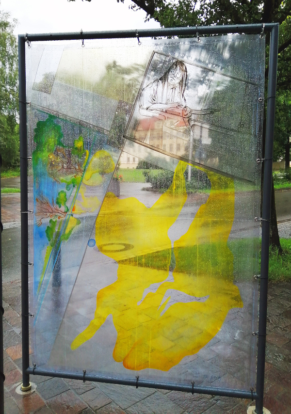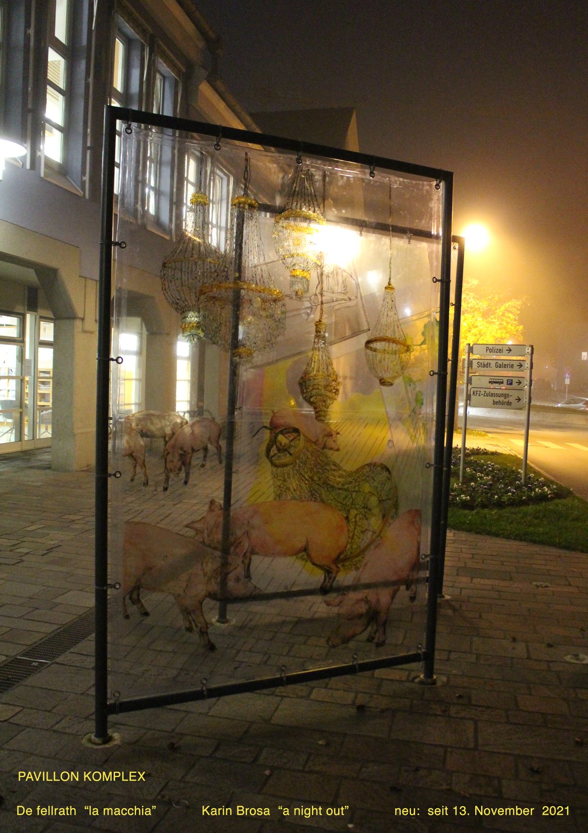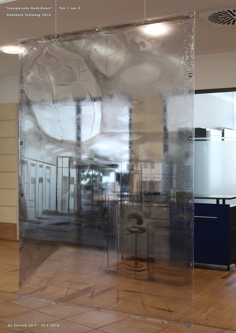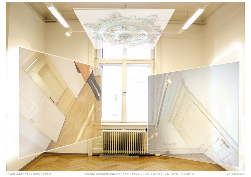 Trotzdem bleibt der Blick frei; die Plane ist durchsichtig und zeigt als digitales Bild ebenfalls eine Raumperspektive, allerdings von einem anderen Standpunkt aus. Die Relativität ist ja gerade die Eigenschaft alles Perspektivischen. Und insofern mischt sich nun der real wahrgenommene Raum mit dem Bild des Raumes zu einem neuen Ganzen.