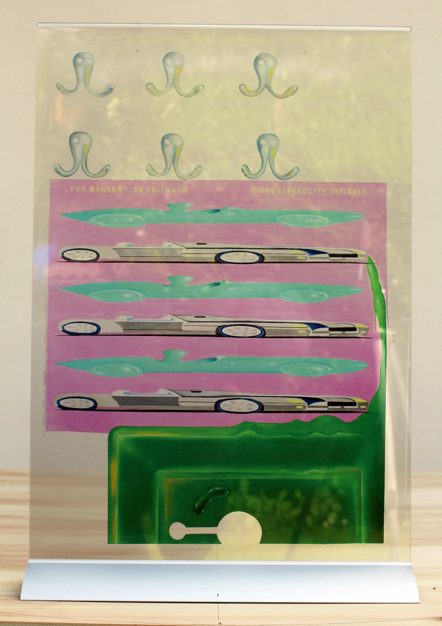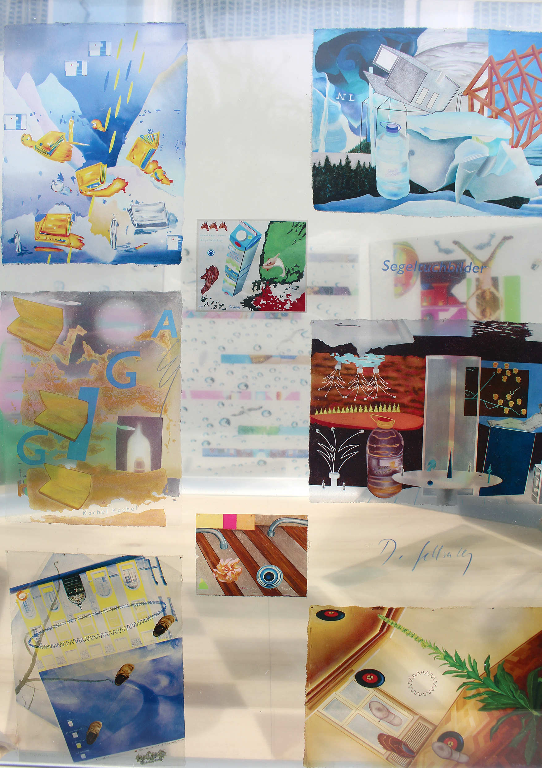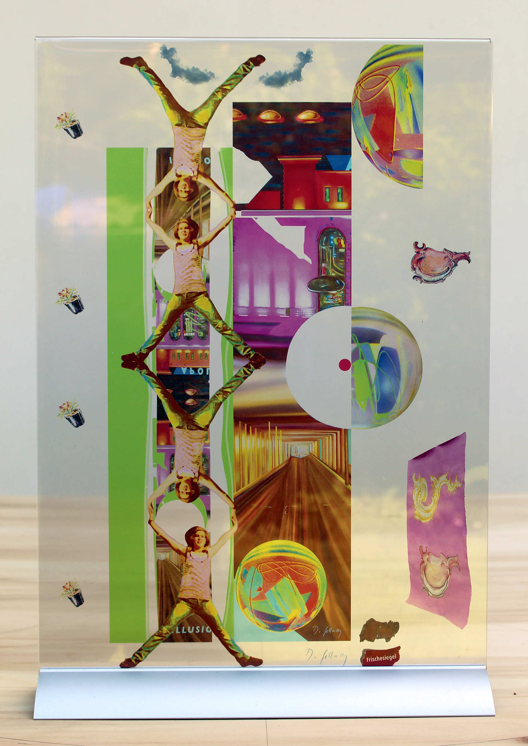Mit jeder Bewegung des Betrachters entstehen neue Konstellationen dieser Zusammensicht: im transparenten Bild mischt sich der im Bild dargestellte Raum 1:1 mit dem Realraum. Welche Säule ist real, welche ist im Bild ? Ist die einzige kleine Figur in dem großen Raum wirklich da, oder ist sie auch Teil des Bildes ?