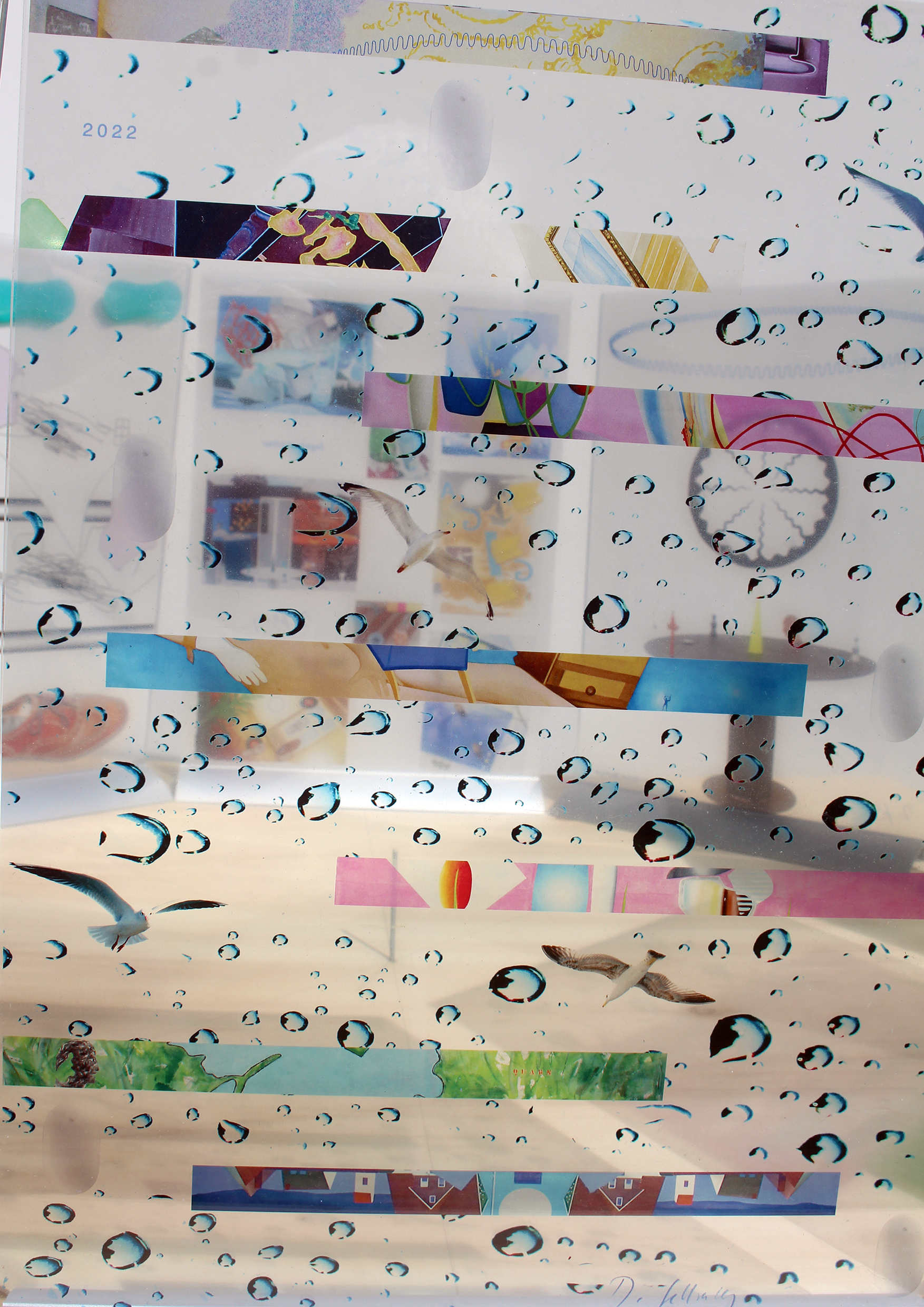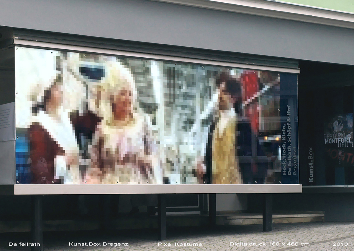 Der Raum spielt noch einmal in einem doppelten Sinn eine Rolle: aus größerer Entfernung ist der Eindruck realistisch, auch wenn sich Bild und Realraum mischen. Von Nahem aber werden deutlich sichtbar die Grundelemente des Bildes, die Pixel. Hier sieht man farbliche Übersteigerungen, fast konstruktiv abstrakte Quadratfolgen, wie Derivate des Raumes, die geisterhaft wirken.